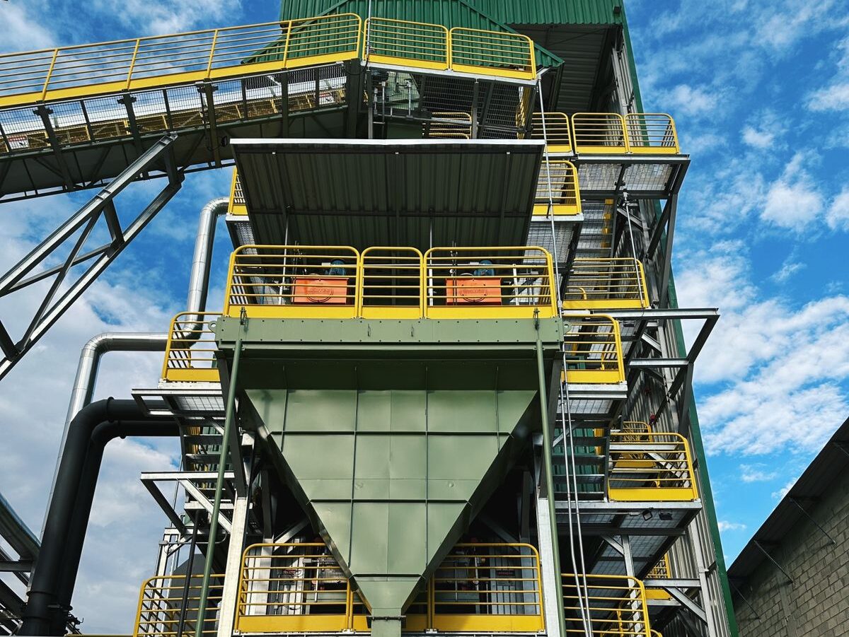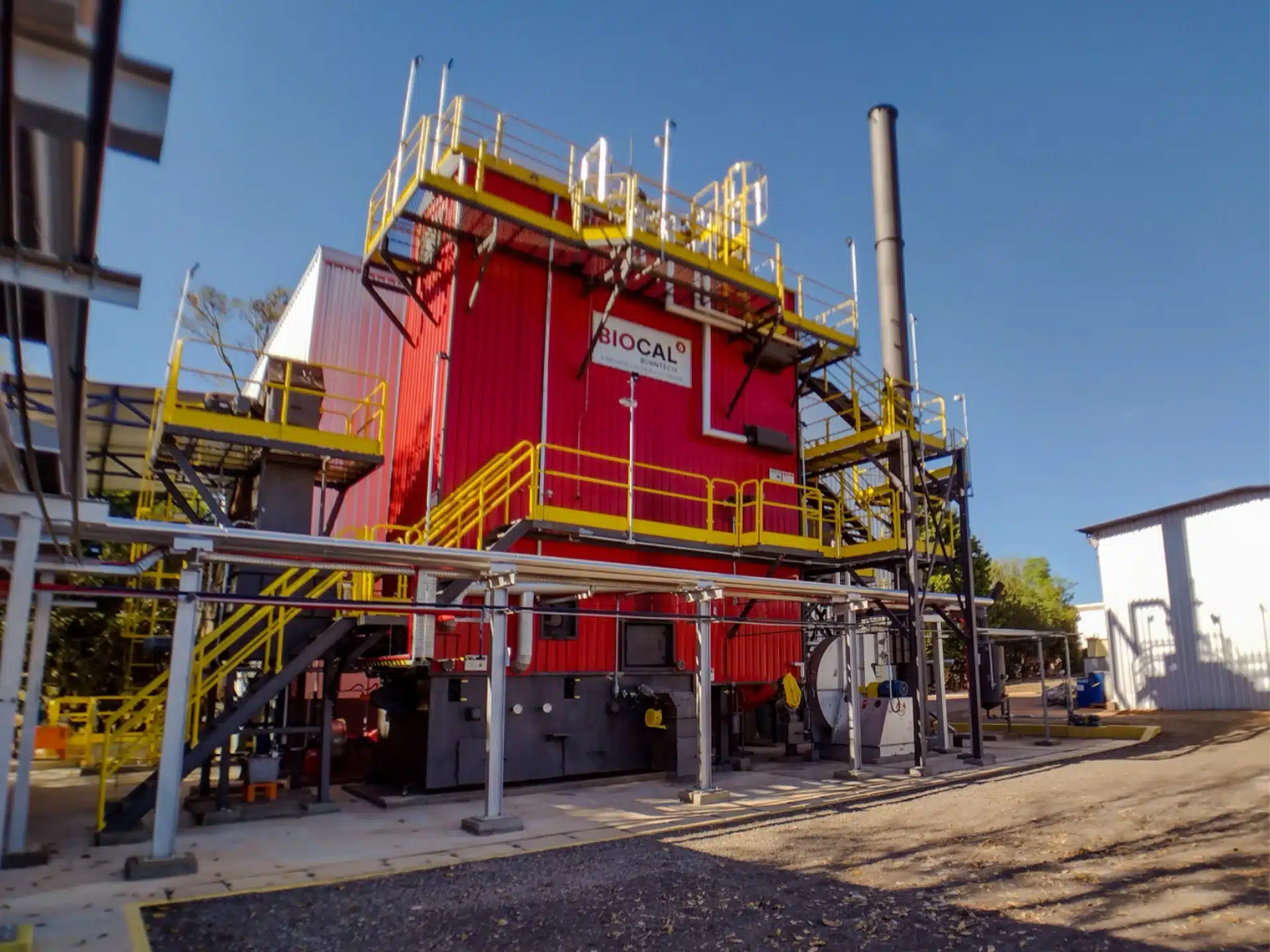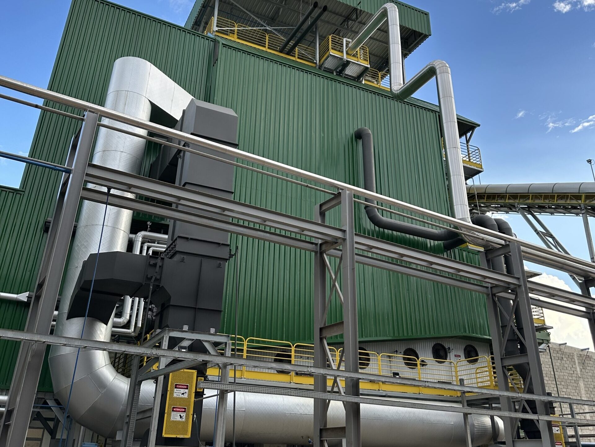 Caldeira a biomassa com capacidade instalada de 45 ton/h, incluindo sistema de armazenamento de combustível e sistema de filtragem composto por filtro multiciclone e filtro de mangas.